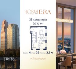 3-комн. квартира в ЖК "Era" на 35 этаже в 43 этажном здании Корпус 4. Общая площадь: 67.6 кв.м., жилая: 41.30 кв.м. Высота потолков 3.30 м.