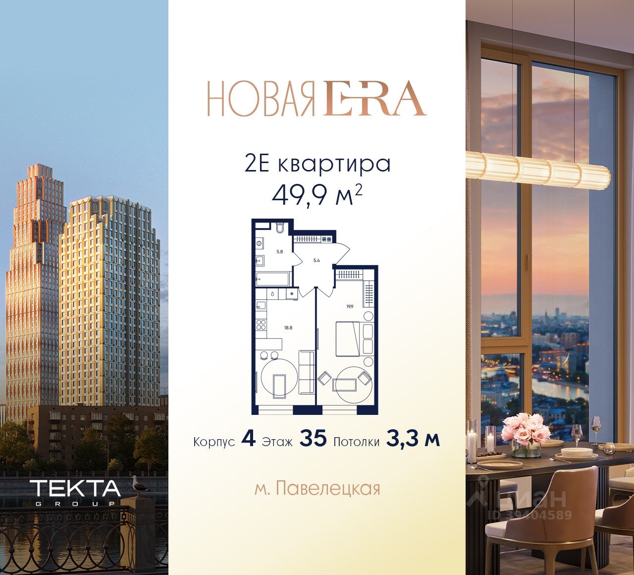 2-комн. квартира в ЖК "Era" на 35 этаже в 43 этажном здании Корпус 4. Общая площадь: 49.9 кв.м., жилая: 30.20 кв.м. Высота потолков 3.30 м.