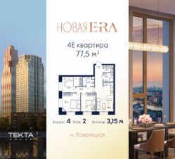 4-комн. квартира в ЖК "Era" на 2 этаже в 43 этажном здании Корпус 4. Общая площадь: 77.5 кв.м., жилая: 49.60 кв.м. Высота потолков 3.15 м.