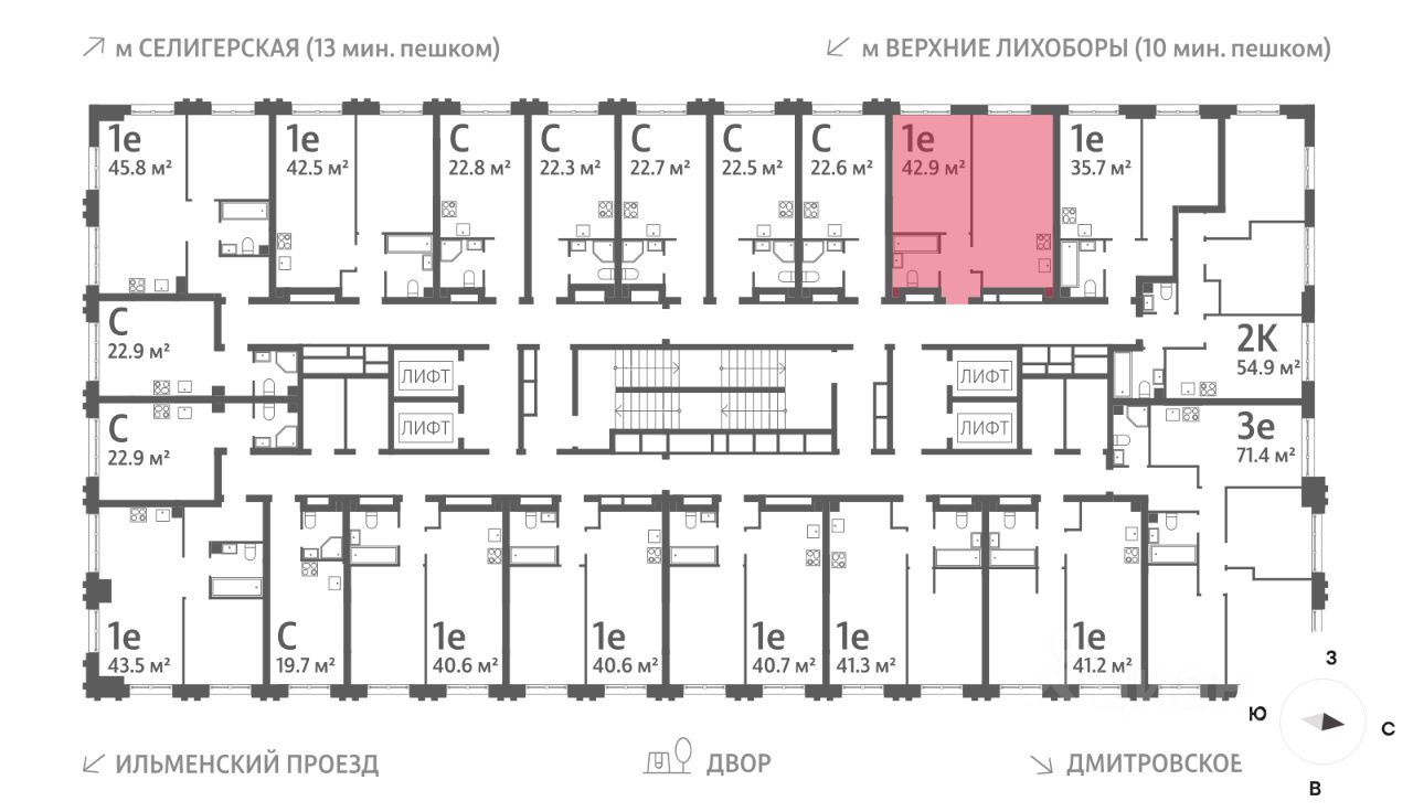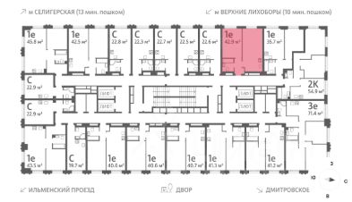 Продается 1-комнатная квартира общей площадью 42.9 кв. метров на 10 этаже жилого комплекса Дмитровское небо. Комплекс возводится в Северном административном округе в районе Западное Дегунино в Ильменском проезде, в 5 минутах ходьбы от метро "Верхние Лихоборы", а автомобилисты могут за пару минут выехать на Ильменский проезд и по нему добраться до Дмитровского шоссе.