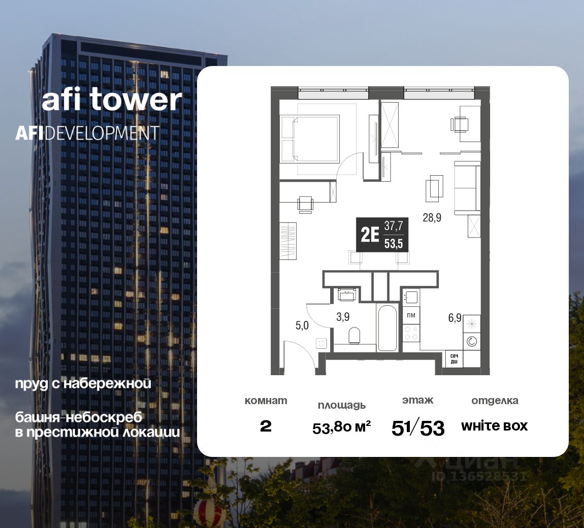 2-комнатная квартира площадью 53,8 кв.м., расположенная на 51 этаже 53-этажного небоскреба бизнес-класса это именно то, что вы ищете!