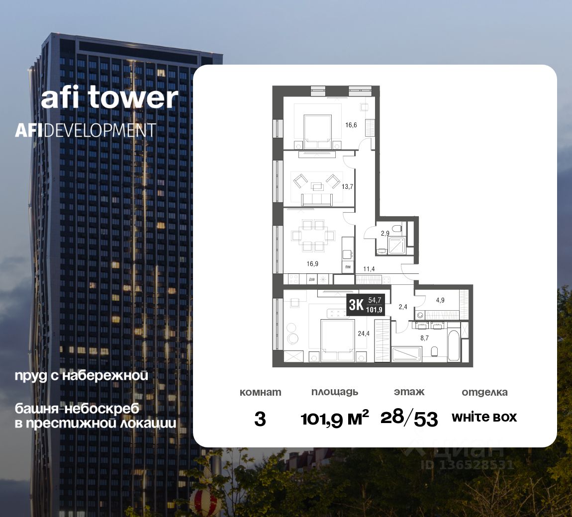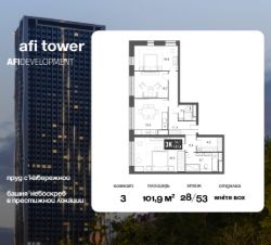 3-комнатная квартира площадью 101,9 кв.м., расположенная на 28 этаже 53-этажного небоскреба бизнес-класса это именно то, что вы ищете!