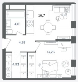 Общая площадь квартиры составляет 44,8 кв. м, жилая площадь — 18,88 кв. м, а кухня впечатляет своими 16,71 кв. м. Высокие потолки 3,2 метра добавляют пространства и света.