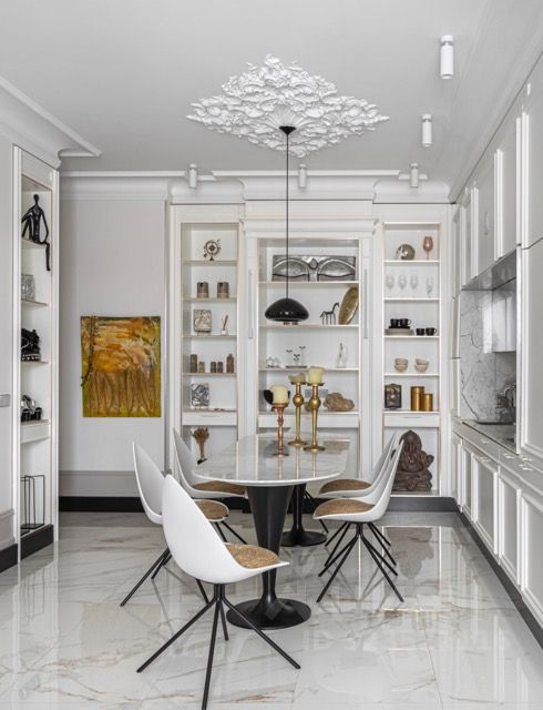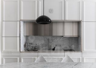 Эстетика интерьера представляет собой гибрид современной и традиционной классики: декоративные короны и дверные порталы соседствуют с современными кухонными поверхностями из нержавеющей стали и авангардными светильниками, что создаёт неповторимую атмосферу.
