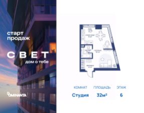 Продаётся студия 32 кв.м. на 6-м этаже 51 этажного дома.