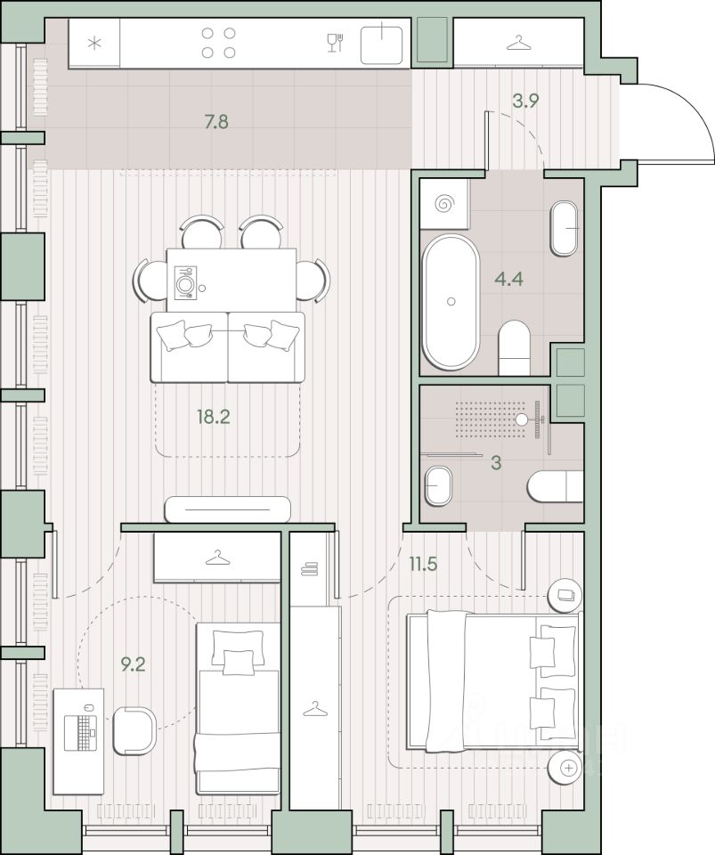 Продаётся 2-комнатная квартира общей площадью 58 кв.м. без отделки. Квартира расположена на 3 этаже корпуса 5.8 в жилом комплексе бизнес-класса "Среда на Лобачевского" в пешей доступности от метро "Аминьевская".