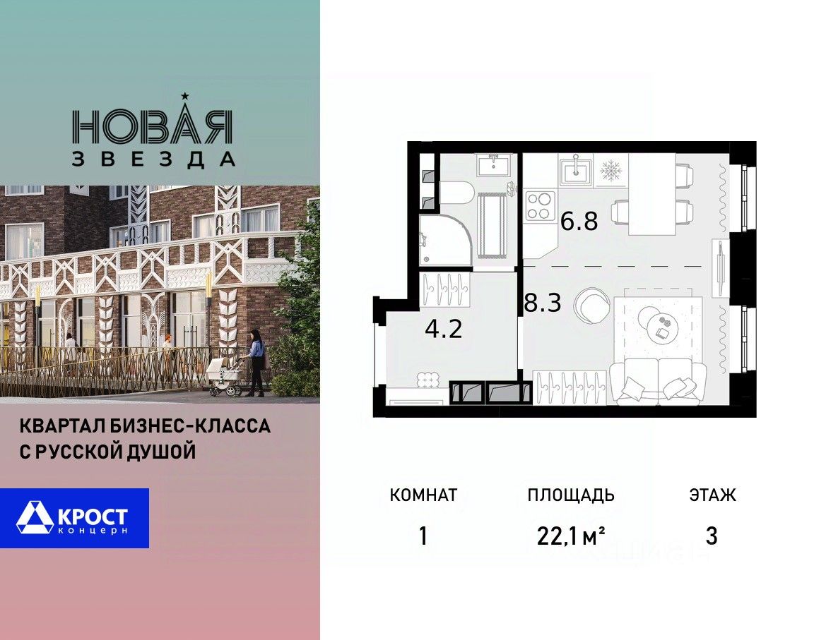 Продаётся 1-к квартира 22.1 кв.м. на 3-м этаже 22 этажного дома, корпус 3 - Резиденция "Краснодар". Без отделки.