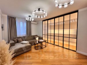 Квартира с новым, современным и полностью завершённым ремонтом. Новая техника, мебель и интерьерные решения. В отделке использованы только качественные материалы, такие как: несколько видов дерева, массив дуба и итальянский керамогранит, мебель и шторы из бархатного велюра.