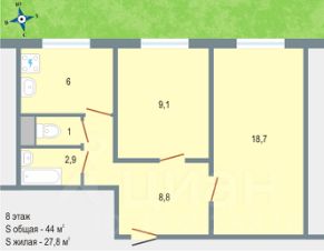 Общая площадь квартиры 44 кв. м. Из них жилая 27,8 кв. м. Две изолированные комнаты 18,7 и 9,1 кв. м. Кухня 6 кв. м с электрической плитой. Просторная прихожая 8,8 кв. м. Высота потолков 2,64 м. Раздельный санузел. Хороший ремонт с элементами дизайна, въезжай и живи. Окна выходят не на дорогу и не во двор (см. на плане дома). Прекрасный вид из окон.