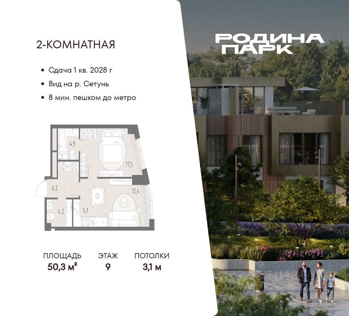 В жилом кластере Родина Парк рядом с природным заказником Долина реки Сетунь продаётся 2-комнатная квартира. Продуманная европланировка, которую легко зонировать под ваши запросы. Потолки от 3,1 м. "Родина Парк" — премиальный семейный кластер с образовательным медиакластером, строящийся на западе Москвы в окружении природного заповедника "Долина реки Сетуни". • Скидки недели на избранный пул лотов • Рассрочка 0% на выгодных условиях до 2 лет • Семейная ипотека, подбор комбо-вариантов ипотечных программ прямо в офисе продаж • Скидки 8% при 100% оплате или ипотеке. ЛОКАЦИЯ: 8 минут пешком до станции БКЛ "Давыдково". 12 минут на автомобиле до Нового Арбата. Удобные выезды на Кутузовский проспект, Аминьевское шоссе. ИНФРАСТРУКТУРА И СЕРВИСЫ ДЛЯ ЖИТЕЛЕЙ - Уникальная экосистема для развития, здоровья и творчества на территории 3,5 Га: - Первый в России образовательный медиакластер (с участием Русской медиагруппы) для творческого развития детей и взрослых с возможностью получить востребованную профессию в сфере шоу-бизнеса. - Инфраструктура и сервисы для семей с детьми на территории жилого кластера (частный детский сад, детские игровые пространства, творческие студии для занятий музыкой и танцами, безопасная и комфортная среда для детей и родителей), событийно-культурная площадка для проведения семейного досуга); - Здоровая среда (биохакинг-центр, фитнес-зал и спортивная инфраструктура во дворе, медитационные пространства, инженерные решения для освещения, свежего воздуха и очистки воды, сервисы красоты и поддержания активного долголетия); - Сервисы заботы (инфраструктура комфорта - подземный паркинг, кладовые, колясочные, консьерж- сервис, умный дом, мобильное приложение, профессиональная управляющая компания, сервисы охраны и обеспечение абсолютной безопасности) - Комьюнити резидентов (социальные пространства для дружеского и делового общения - летний атриум с уличным кинотеатром, зоны отдыха, кафе и рестораны, комьюнити-сервис с культурно- событийной программой в медиакластере); - Модуль благосостояния (комфортные пространства для работы и саморазвития - коворкинги и переговорные). ИНФРАСТРУКТУРА РАЙОНА: Насыщенная образовательная среда: филиалы МГИМО, МГУ, МГТУ, Сколково. Топовые школы: 6 лучших частных школ Москвы и области (Forbes) в 10 минутах езды. Природное окружение для пеших прогулок, спорта и отдыха. "Родина Парк" — это место, где растут и дети, и ваши возможности. Экосистема, где всё подчинено развитию — физически, профессионально, творчески.