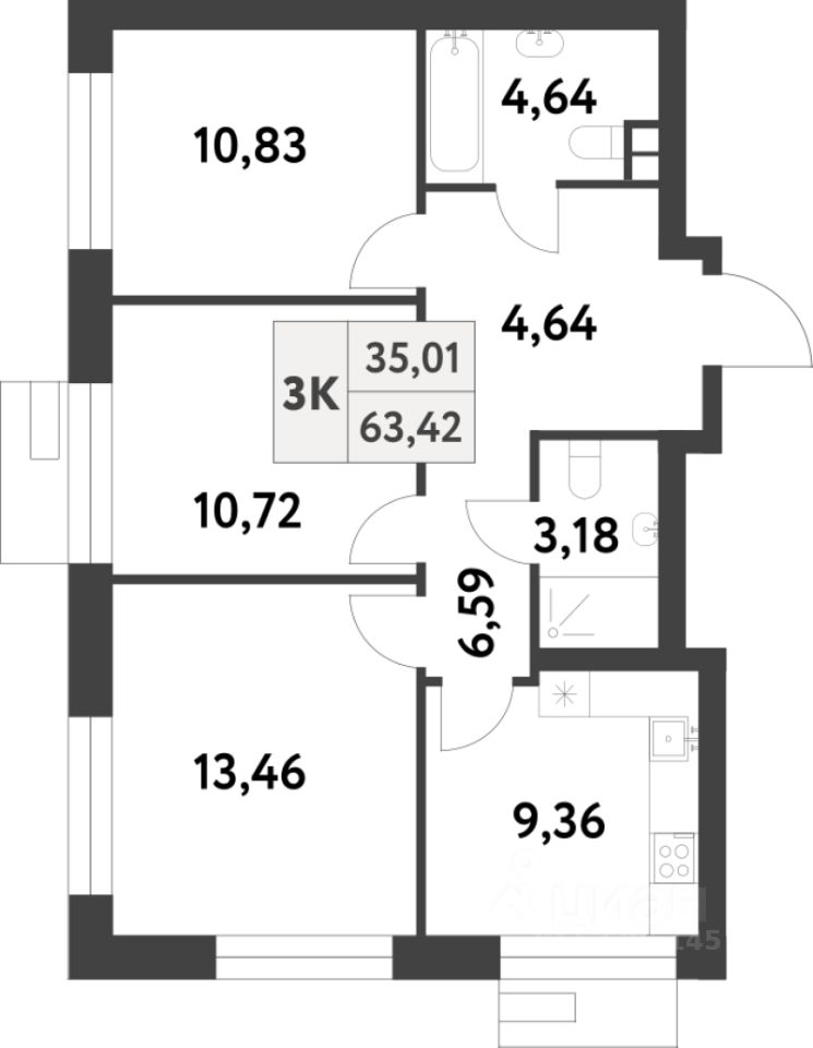 Продаётся 3-комнатная квартира в строящемся доме (Корпус 2), срок сдачи: IV-кв. 2026, общей площадью 63 кв.м., на 2 этаже. Многоквартирный жилой комплекс по адресу: г. Москва, поселение Сосенское, поселок Газопровод, улица Лесные Поляны 5-я, земельный участок 20
