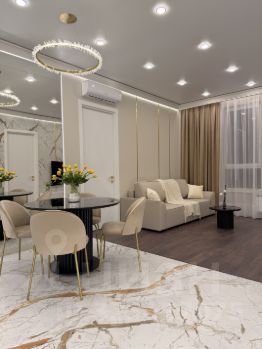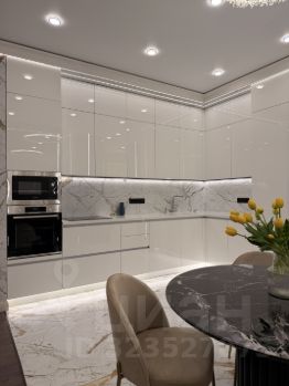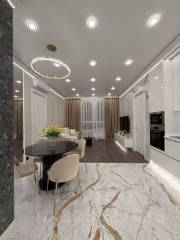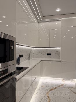 Кухня-гостиная 30м2 с 54 сценариями освещения, полностью укомплектована всей техникой(посудомоечная машина, микроволновая печь, духовой шкаф, встроенный холодильник, вытяжка, варочная панель).