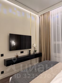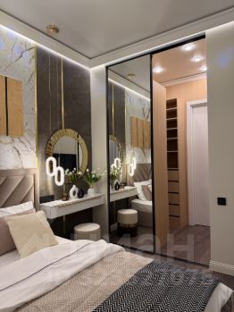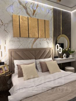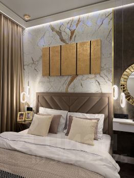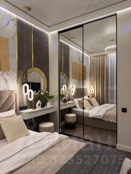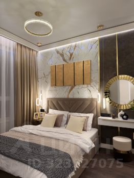 Спальня с 16 сценариями освещения, находится в мастер-блоке общей площадью 20 м2, и имеет отдельный, собственный санузел с душевой и ванной и гардеробную комнату с сейфом, двуспальная кровать 160/200 см с подъёмным механизмом, с ортопедическим матрасом премиум-класса переменной жесткости, состоящим из блока 2000 независимых пружин. ТВ 55 дюймов, кондиционер, электрокарниз, управляется Алисой.