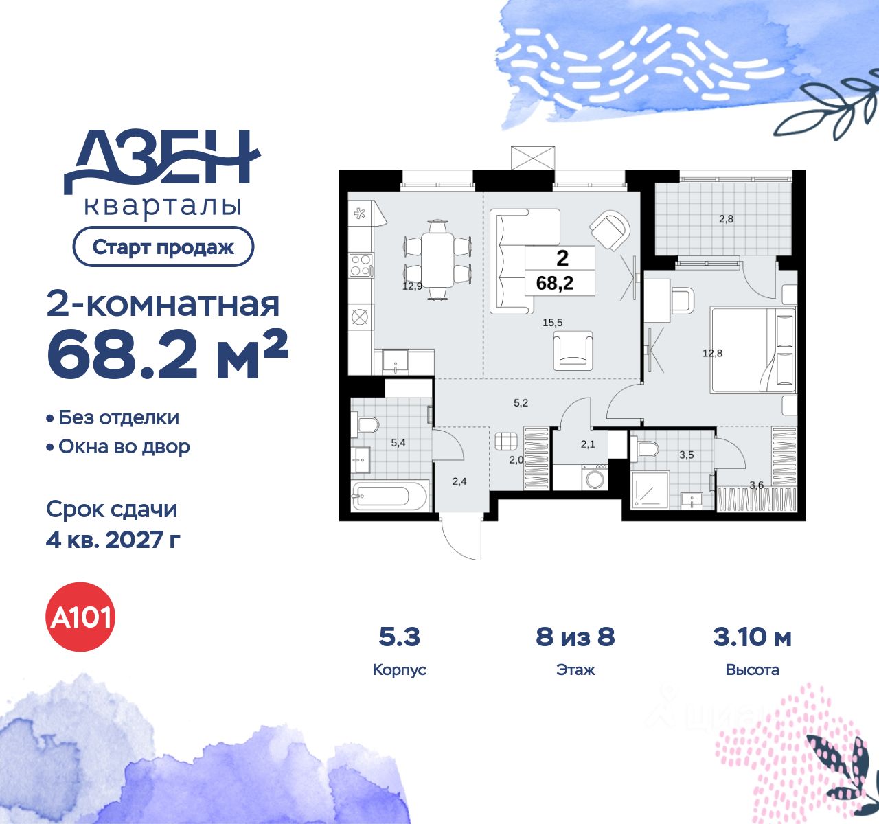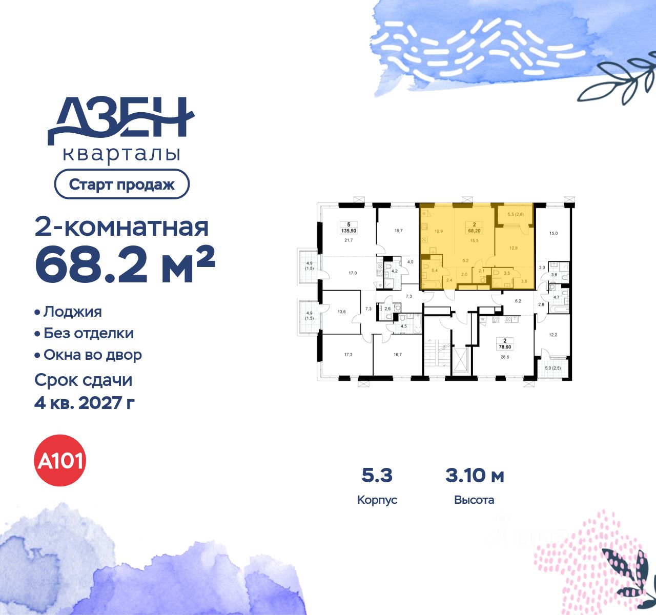 Продается двухкомнатная квартира 298 в новостройке ЖК "Дзен-кварталы" по адресу Москва, ТиНАО, Новомосковский АО, Сосенское С/П, Москва, Новомосковский административный округ, район Коммунарка, ЖК Дзен-кварталы. Общая площадь квартиры - 68.20 кв. м., этаж 8 из 8, секция 6. Тип проекта, по которому построен дом - монолит, компания-застройщик - ООО "А101". Стоимость квартиры - 21380018 Р. Срок сдачи - 4 квартал 2027.
