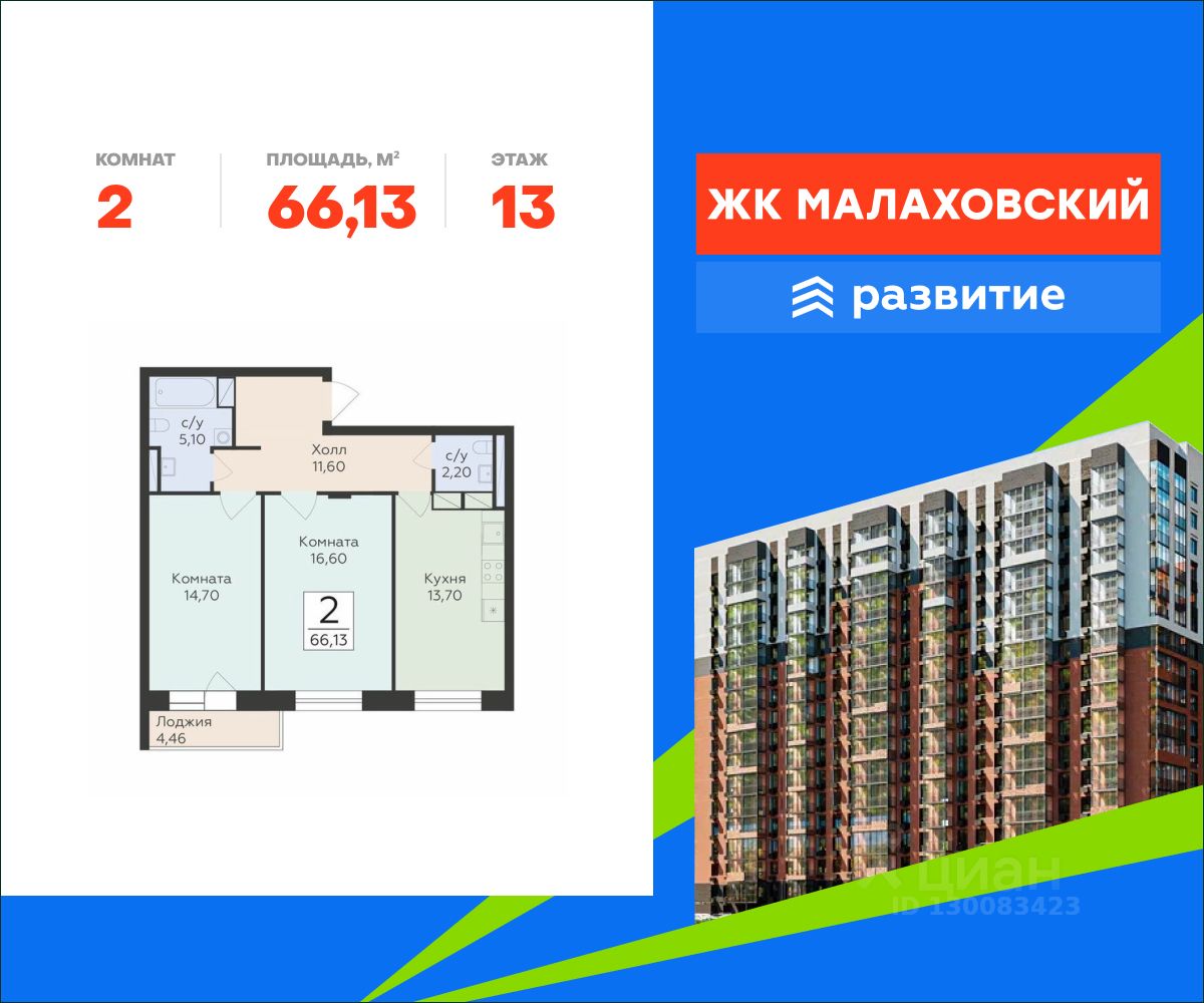 Продается 2-комнатная квартира площадью 66.13 с отделкой White box. Квартира расположена на 13 этаже 17 этажного дома, в 201 корпусе.