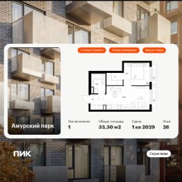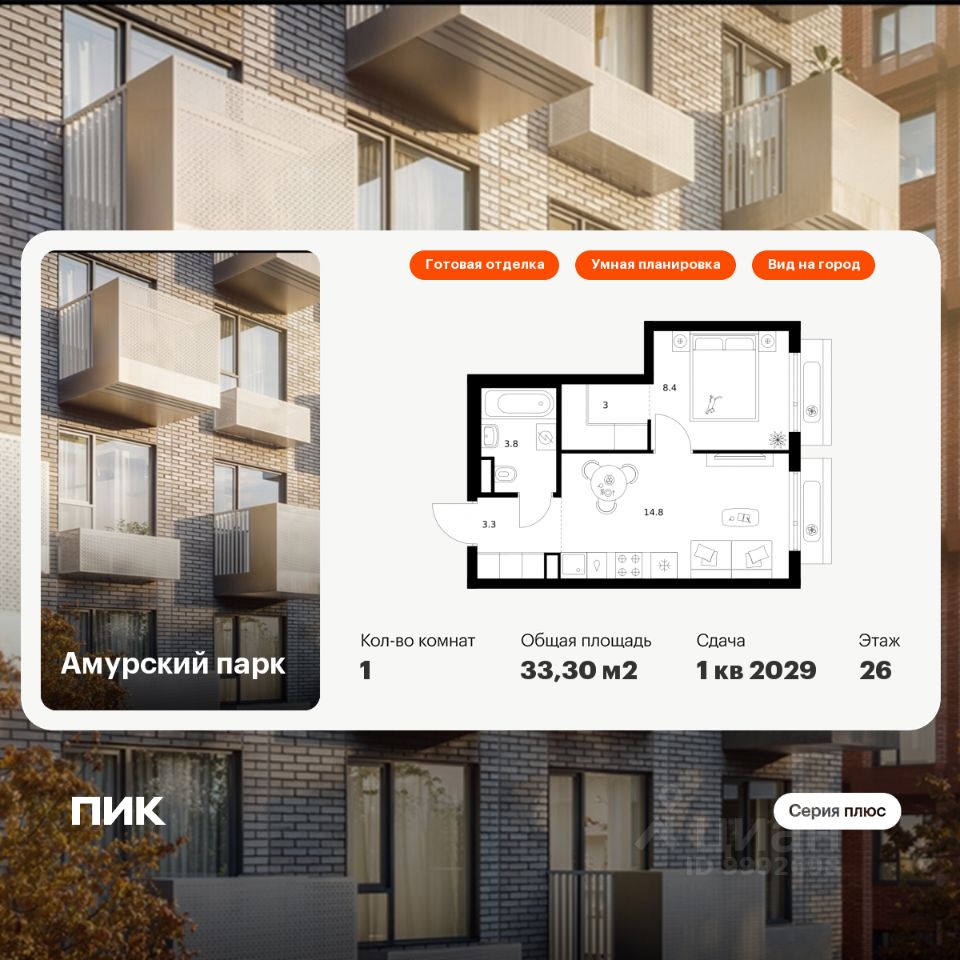 Продаётся 1-комн. квартира площадью 33,3 кв.м на 26 этаже 27 этажного дома (Корпус 4.3, Секция 3) проекта ПИК Амурский парк. Светлый просторный подъезд на уровне земли, функциональная планировка, большие окна, c отделкой.