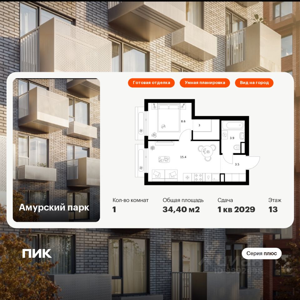 Продаётся 1-комн. квартира площадью 34,4 кв.м на 13 этаже 27 этажного дома (Корпус 4.5, Секция 6) проекта ПИК Амурский парк. Светлый просторный подъезд на уровне земли, функциональная планировка, большие окна, c отделкой.