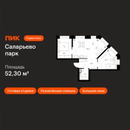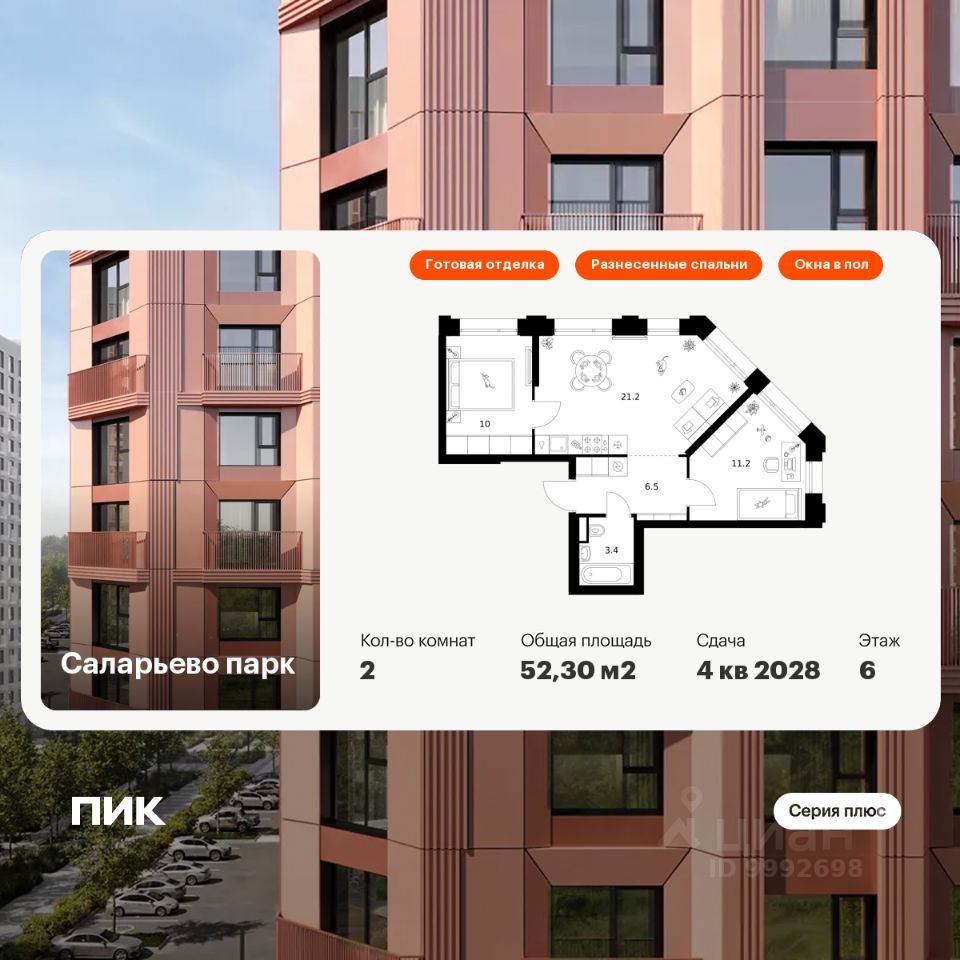 Продаётся 2-комн. квартира площадью 52,3 кв.м на 6 этаже 24 этажного дома (Корпус 82.8, Секция 8) проекта ПИК Саларьево парк. Светлый просторный подъезд на уровне земли, функциональная планировка, большие окна, c отделкой.
