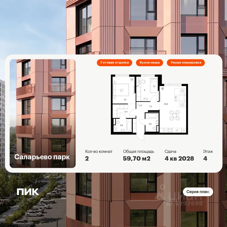Продаётся 2-комн. квартира площадью 59,7 кв.м на 4 этаже 24 этажного дома (Корпус 82.7, Секция 7) проекта ПИК Саларьево парк. Светлый просторный подъезд на уровне земли, функциональная планировка, большие окна, c отделкой.