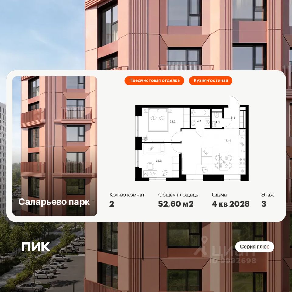 Продаётся 2-комн. квартира площадью 52,6 кв.м на 3 этаже 16 этажного дома (Корпус 82.5, Секция 5) проекта ПИК Саларьево парк. Светлый просторный подъезд на уровне земли, функциональная планировка, большие окна, предчистовая отделка.