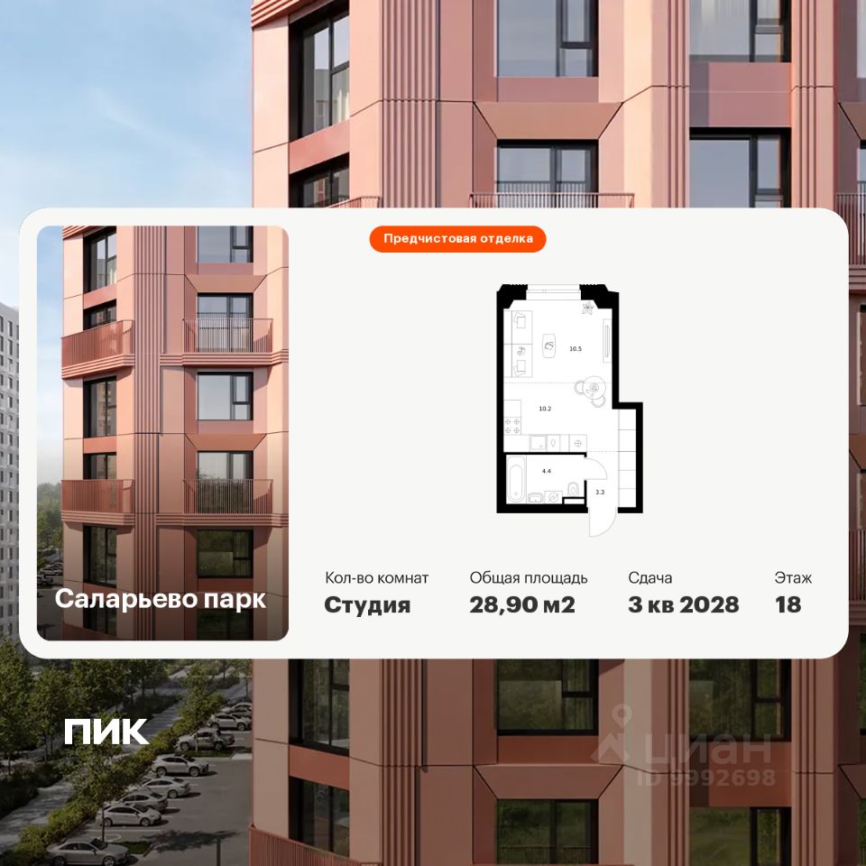 Продаётся квартира-студия площадью 28,9 кв.м на 18 этаже 23 этажного дома (Корпус 69.1, Секция 1) проекта ПИК Саларьево парк. Светлый просторный подъезд на уровне земли, функциональная планировка, большие окна, предчистовая отделка.