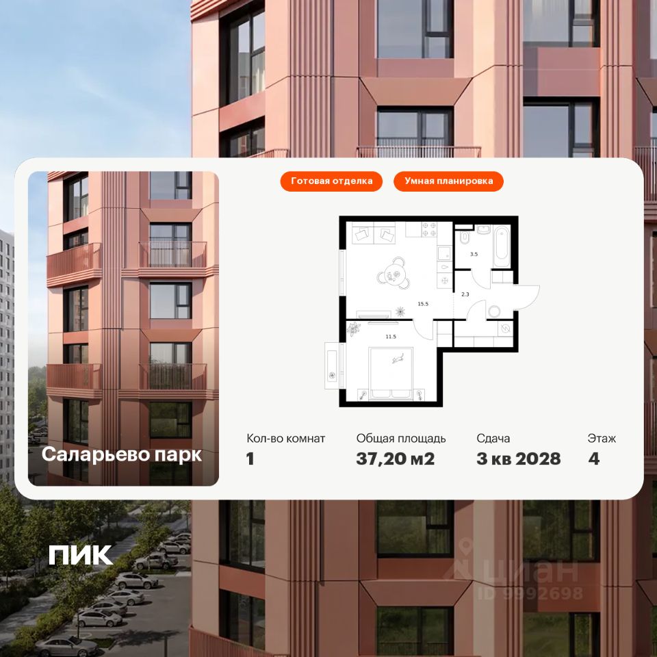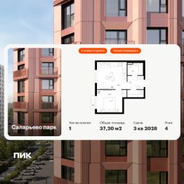 Продаётся 1-комн. квартира площадью 37,2 кв.м на 4 этаже 14 этажного дома (Корпус 69.6, Секция 6) проекта ПИК Саларьево парк. Светлый просторный подъезд на уровне земли, функциональная планировка, большие окна, c отделкой.