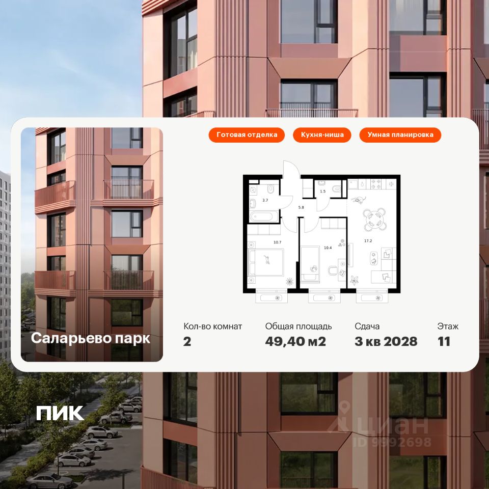 Продаётся 2-комн. квартира площадью 49,4 кв.м на 11 этаже 14 этажного дома (Корпус 69.2, Секция 2) проекта ПИК Саларьево парк. Светлый просторный подъезд на уровне земли, функциональная планировка, большие окна, c отделкой.