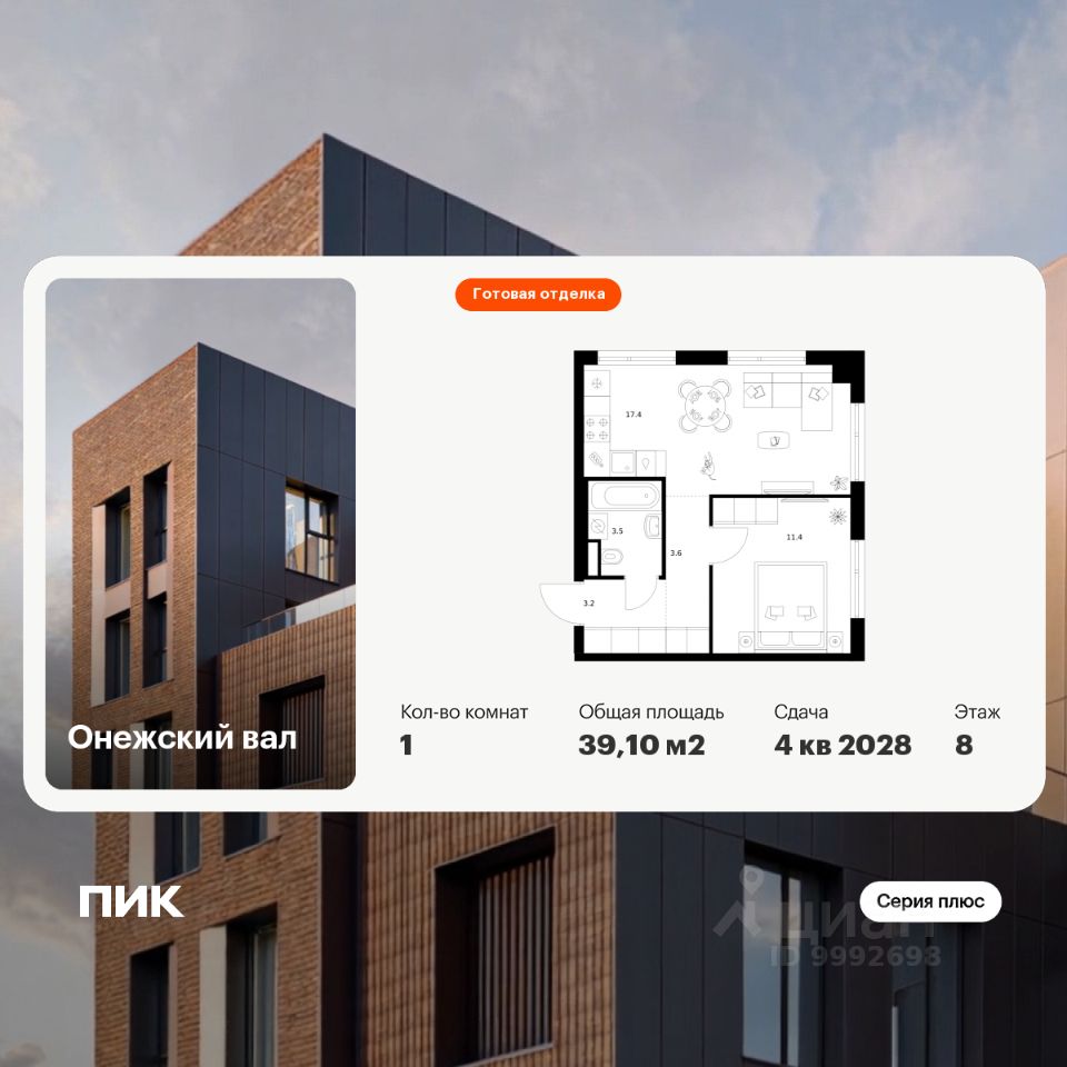 Новостройка! Продается 1-комн. кв-ра площадью 39,1 кв.м, (Корпус 1.1.2, Секция 2) 8 этаж 8-этажного дома в Онежский вал от ПИК. Квартал "Серии плюс" строится на севере Москвы, в 10 минутах пешком от станции метро "Селигерская" и МЦД "Моссельмаш". Проект понравится всем, кто привык к комфортной жизни и ценит возможность оставаться в ритме большого города и быстро добираться до центра столицы.