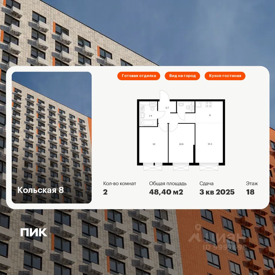 Продаётся 2-комн. квартира площадью 48,4 кв.м на 18 этаже 24 этажного дома (Корпус 2.2, Секция 5) проекта ПИК Кольская 8. Светлый просторный подъезд на уровне земли, функциональная планировка, большие окна, c отделкой.
