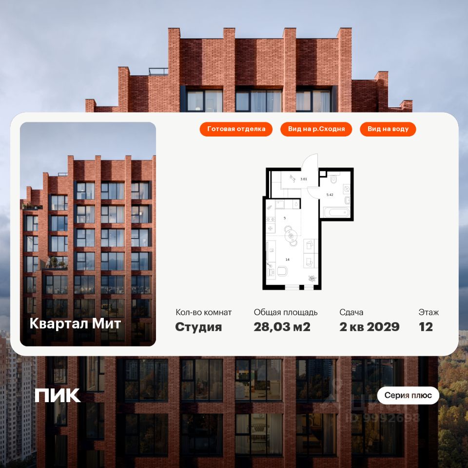 Новостройка! Продается 1-комн. кв-ра площадью 28,03 кв.м, (Корпус 3.4, Секция 4) 12 этаж 32-этажного дома в Квартал Мит от ПИК. "Квартал Мит" строится в экологически чистом районе Митино, где по соседству расположен большой лесопарк, а с двух сторон протекают реки Сходня и Журавка. Для семей с детьми здесь появится школа и два детских сада.