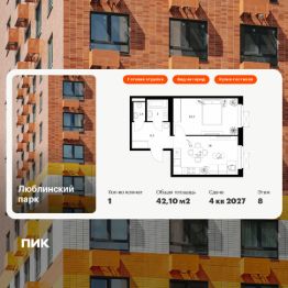Продаётся 1-комн. квартира площадью 42,1 кв.м на 8 этаже 25 этажного дома (Корпус 19, Секция 1) проекта ПИК Люблинский парк. Светлый просторный подъезд на уровне земли, функциональная планировка, большие окна, c отделкой.