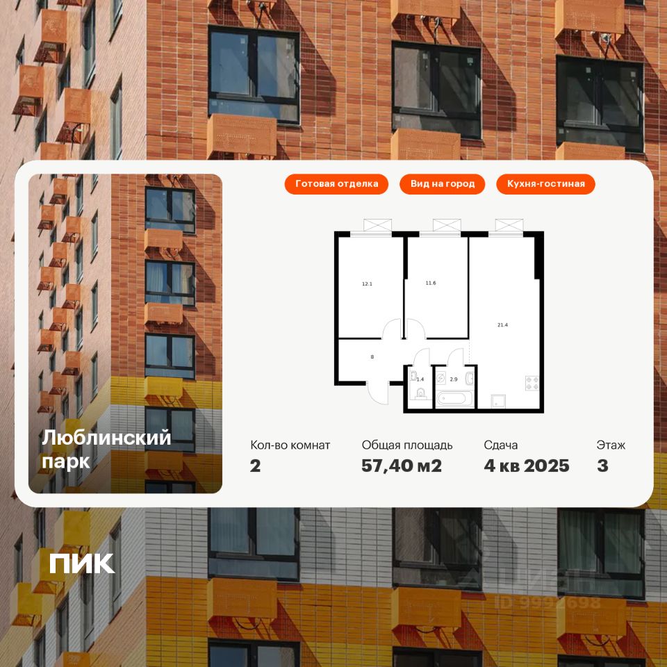 Продаётся 2-комн. квартира площадью 57,4 кв.м на 3 этаже 16 этажного дома (Корпус 12, Секция 3) проекта ПИК Люблинский парк. Светлый просторный подъезд на уровне земли, функциональная планировка, большие окна, c отделкой.