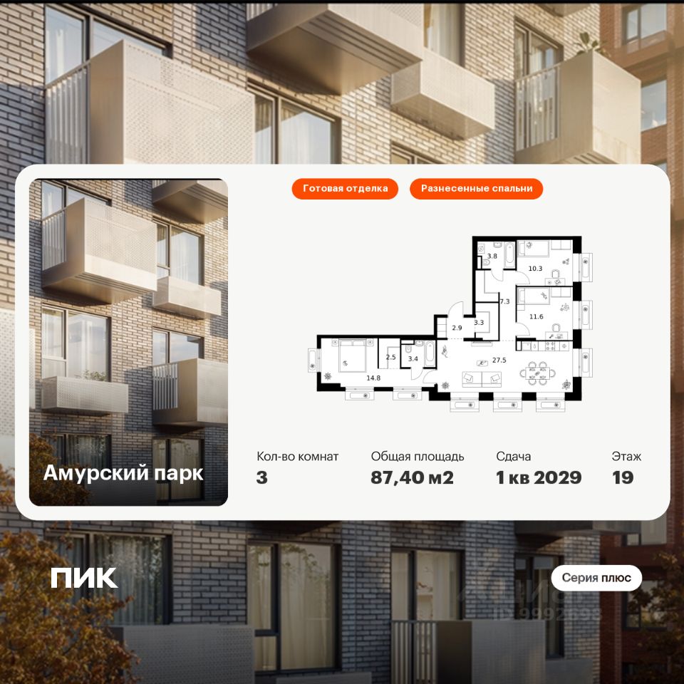 Продаётся 3-комн. квартира площадью 87,4 кв.м на 19 этаже 19 этажного дома (Корпус 4.4, Секция 5) проекта ПИК Амурский парк. Светлый просторный подъезд на уровне земли, функциональная планировка, большие окна, c отделкой.