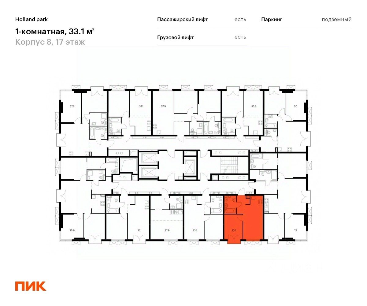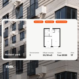 Продаётся 1-комн. квартира площадью 33,1 кв.м на 17 этаже 24 этажного дома (Корпус 8, Секция 4) проекта ПИК Holland park. Светлый просторный подъезд на уровне земли, функциональная планировка, большие окна, без отделки.