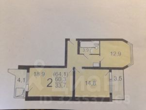 Квартира расположена на 13 этаже 16-этажного дома, комнаты раздельные, их площадь 18,9 и 14,8 кв. м, площадь кухни 12,9 кв. м. Санузел совмещённый. Две лоджии: одна (северная) в сторону большого двора с детской игровой площадкой и спортивными снарядами, вторая (южная) в сторону улицы.