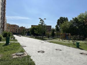 Зеленый огромный внутренний двор с детскими и спортивными площадками. Широкие и длинные тротуары. Двор без машин.