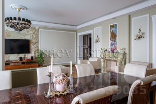 В деталях интерьера выполнена отделка из оникса, натурального дерева, подоконники из камня. Квартира укомплектована дорогой качественной мебелью и техникой - Kuppersbusch, Asko, Liebherr.