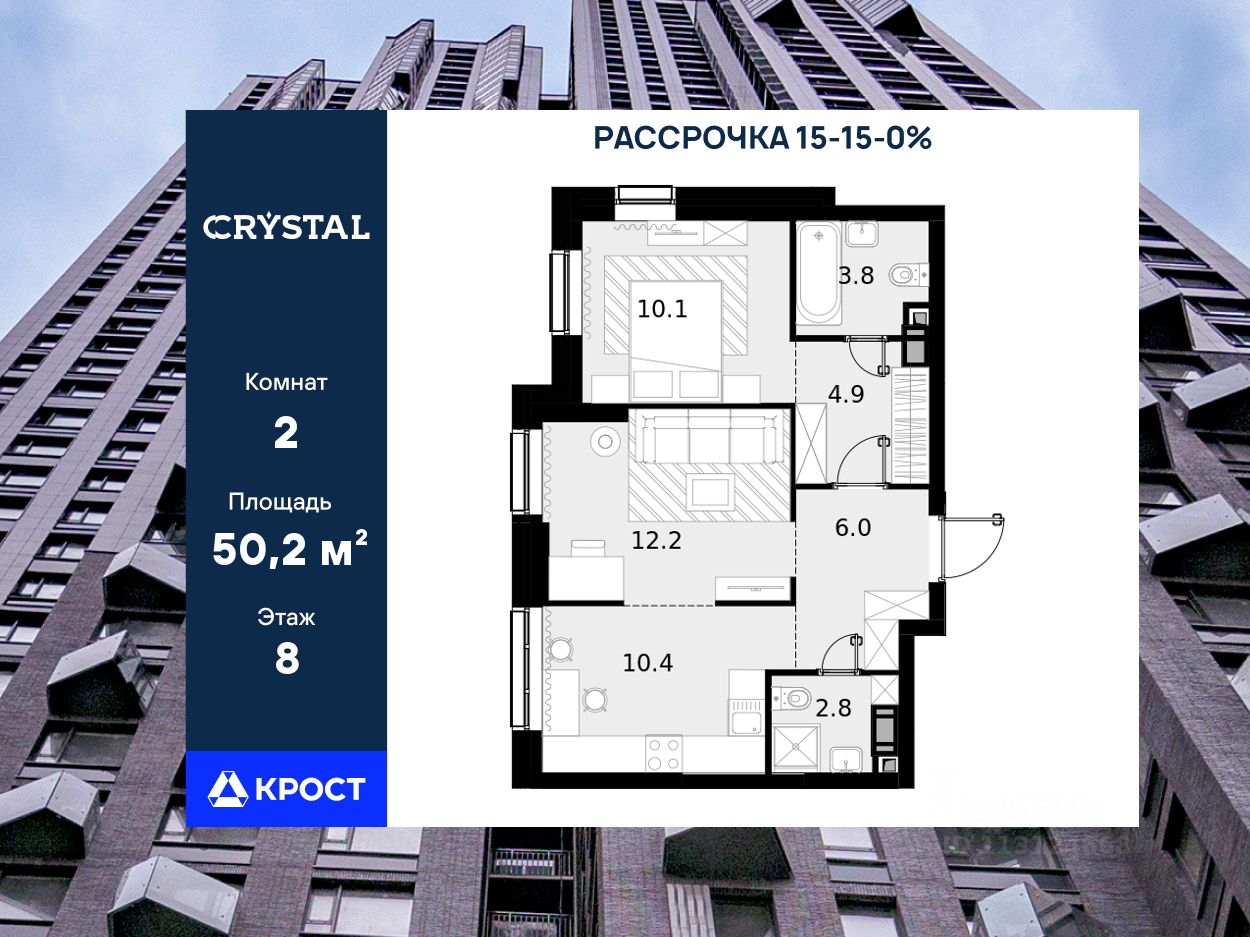 Однокомнатная квартира площадью 50,2 кв.м. на 8 этаже дома бизнес-класса "CRYSTAL Трилогия".