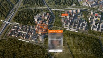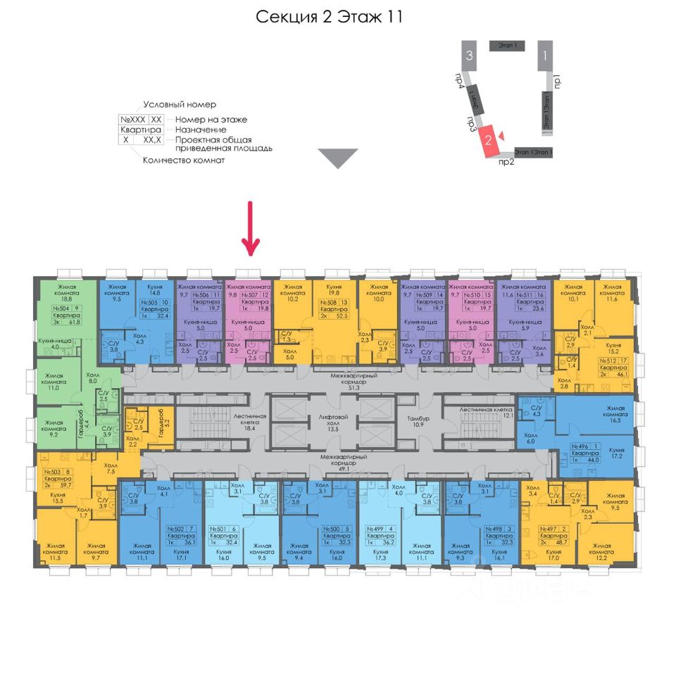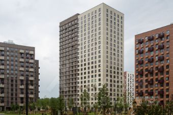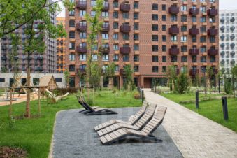 Вид — на солнечную сторону, на один из лучших в проекте дворов, в прострел между соседними секциями.