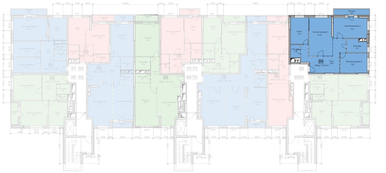 - всего 99 квартир в 3 подъездах на 10 этажах;