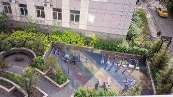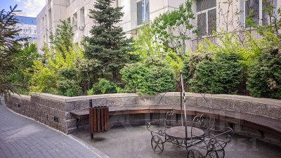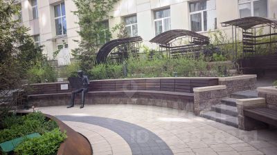 В доме имеется подземный паркинг, своя огороженная территория, охрана, красивый зеленый двор с беседками и скульптурами, есть детская и спортивная площадки.