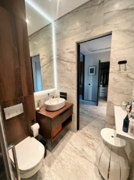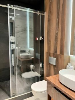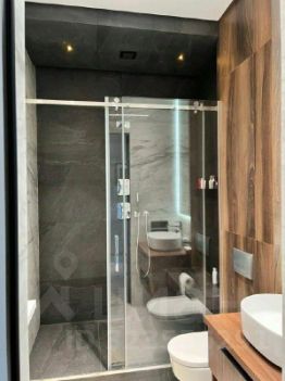 Многоуровневое освещение, натяжные потолки, тропический душ с сидением, розетки Legrand.