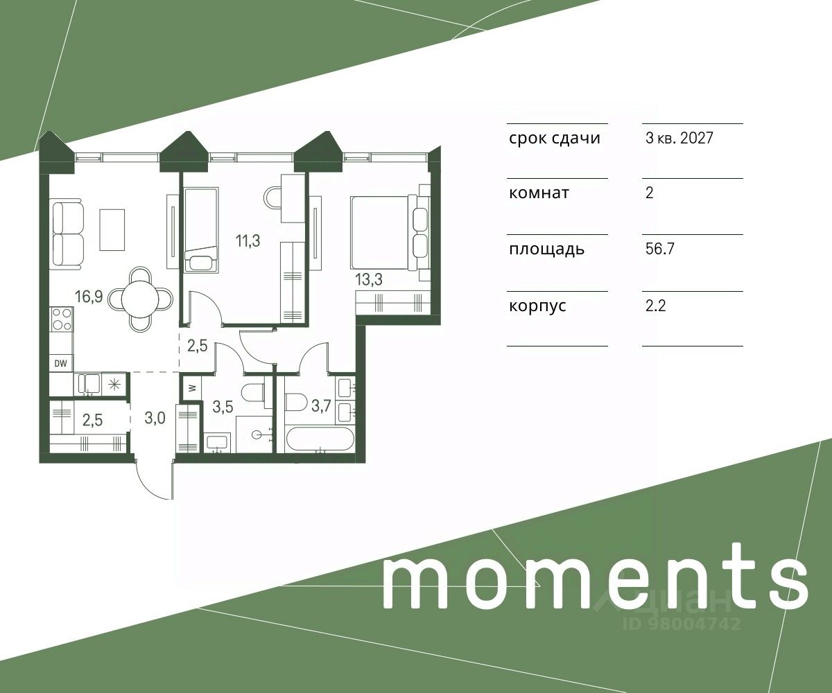 Продается 2-к. квартира номер 1057 общей площадью 56.7 кв.м. на 14-м этаже 34 этажного дома, корпус 2.2. С отделкой White Box.