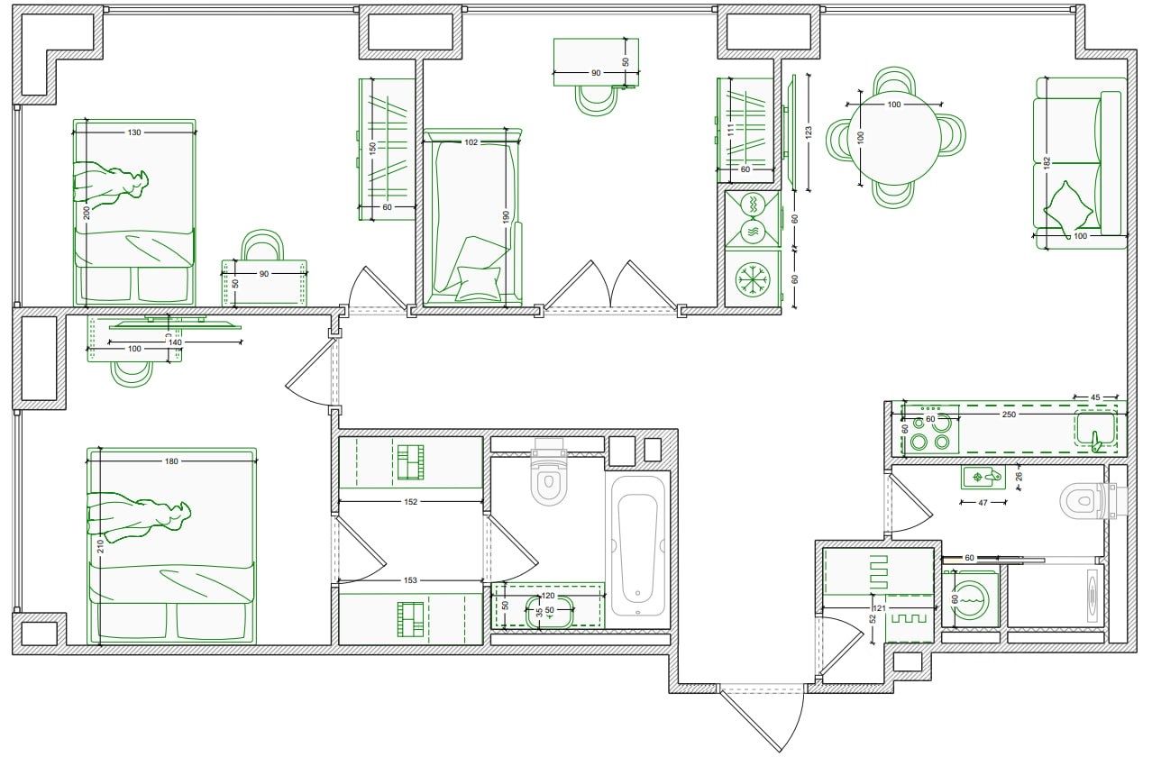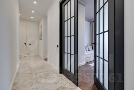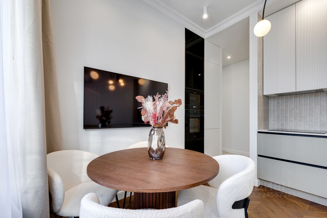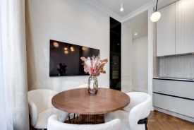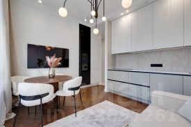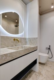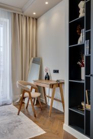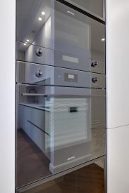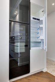 Ремонт реализуется из дорогостоящих материалов. Каменные и дубовые столешницы, на полу дубовый паркет. Бытовая техника премиальных европейский брендов SMEG и ASKO. Фасады всей мебели - эмаль.