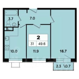 — просторная кухня 10 м2, 2 комнаты - 11,9 и 16,7 м2