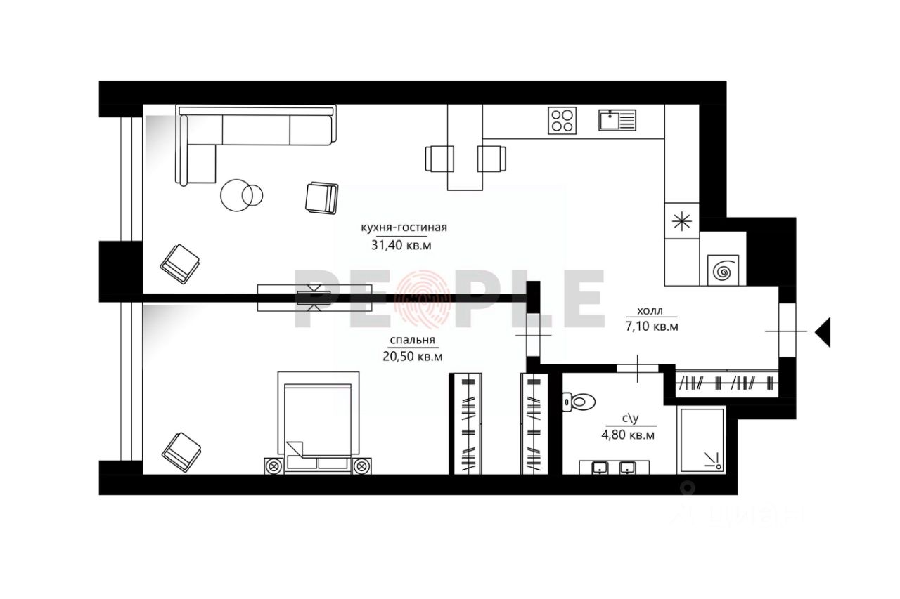 Апартаменты 62.6 м² с панорамными видами в ЖК "Поклонная 9" | 1 спальня