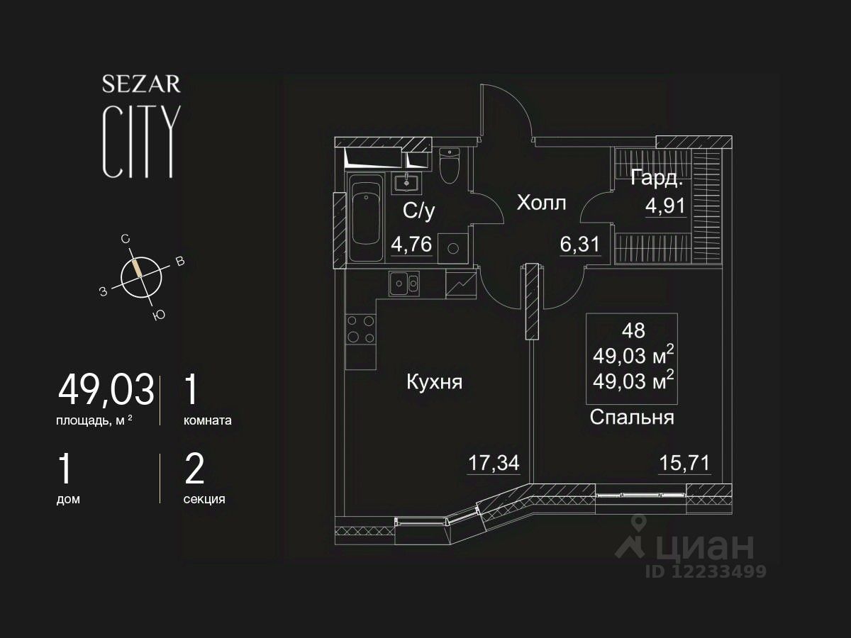 Продается 1-комнатная квартира в ЖК SEZAR CITY на 3 этаже. Общая площадь квартиры составляет 49,03 кв.м. Квартира без отделки. Срок сдачи - 2027 год.