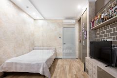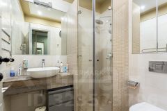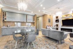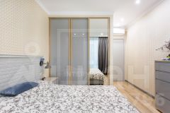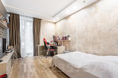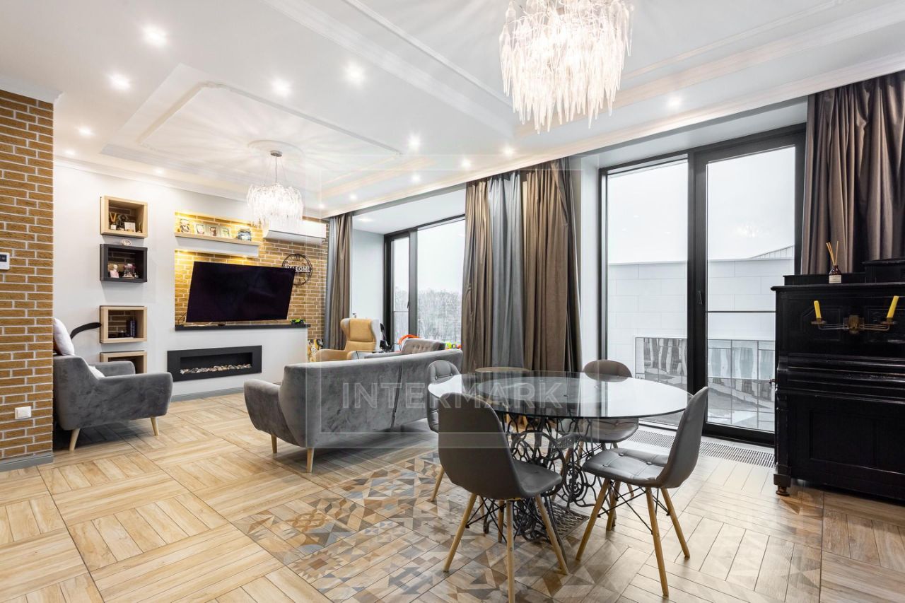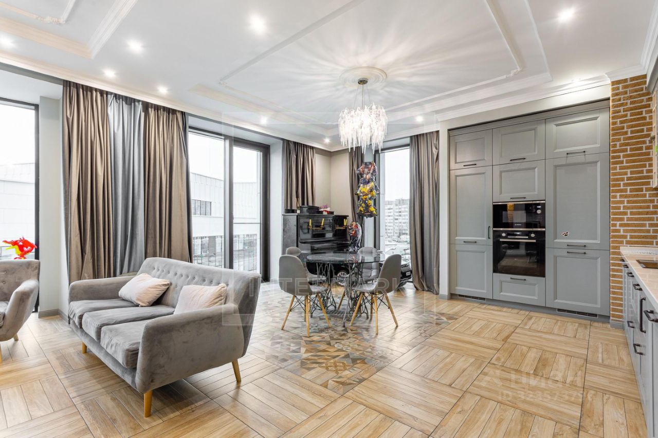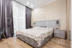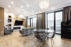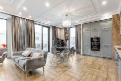 Площадь апартамента 116 в. м., высота потолков 3 метра. Шесть панорамных окон. Планировка: просторная кухня-гостиная с видом на парк, 2 спальни, 2 санузла, кабинет. Предусмотрено достаточно места для хранения. Выполнена отделка с использованием импортных материалов.