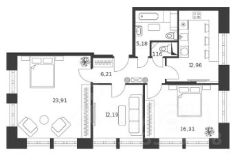 Большая гостиная 24 м², изолированные комнаты 12 и 16 кв.м, кухня 12.9 кв.м и санузлы 5.5. и 1.5 кв.м.