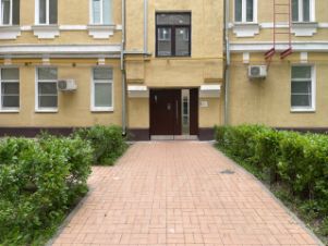 Расположена в охраняемом закрытом дворе с отдельным въездом под шлагбаумом.